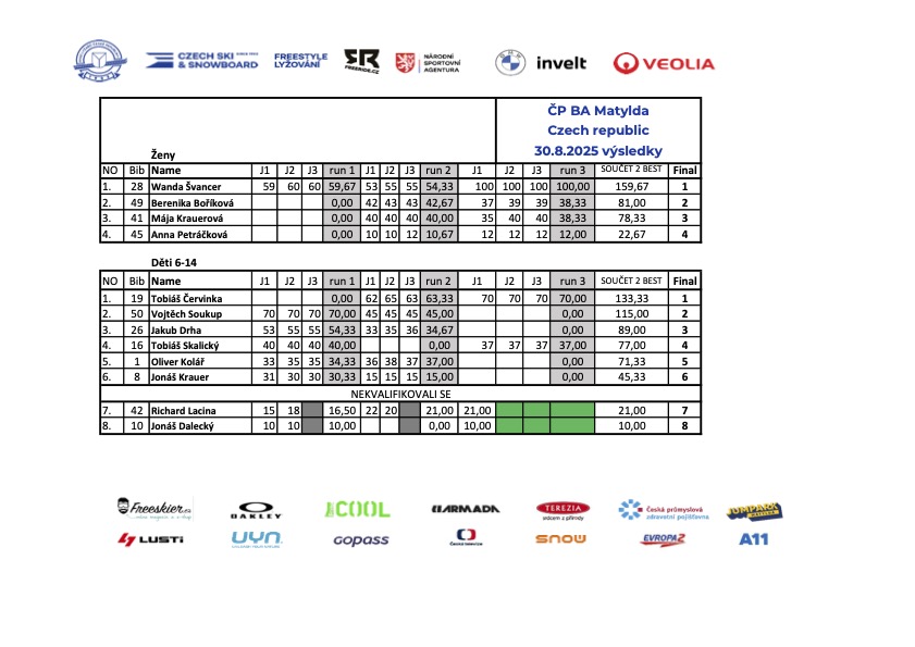 O víkendu 30.–31. 8. 2025 proběhla první zastávka Czech Freeski Tour pro sezónu 2025–2026. Závodníci se utkali na skoku do vody na mostecké Matyldě (www.jumparkmatylda.cz) a předvedli skvělé výkony i pořádnou dávku odvahy.